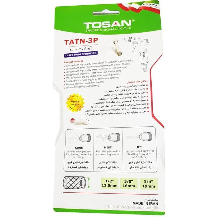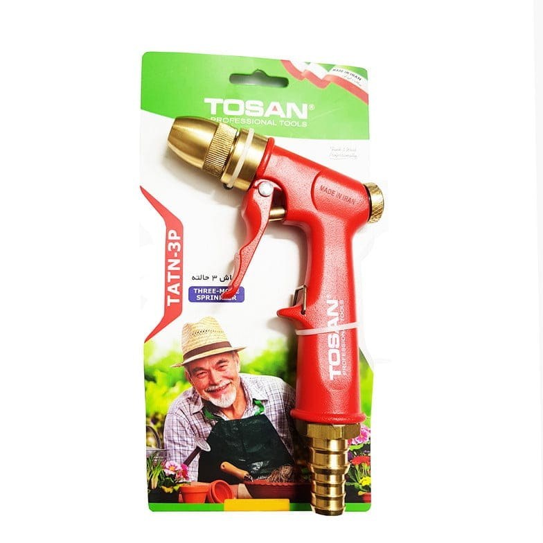 این آب پاش از برند توسن، ساخت کشور ایران می باشد و محصولی مناسب جهت آبیاری درختان و گیاهان، خودرو و انواع سطوح مختلف است. این آب پاش دارای بدنه آلومینیومی با روکش رنگ استاتیکی بوده و دارای سوپاپ برنجی با کیفیت می باشد. این محصول دارای سه حالت مجزا پر فشار گسترده و نقطه ای و کم فشار گسترده،جهت پاشش آب است و مجهز به دنباله شیلنگ خور برنجی با قابلیت نصب 3 سایز شیلنگ می باشد. این آب پاش سه حالته دارای ضامن فلزی استیل به جهت پاشش مداوم است. اهرم آلومینیومی ارگونومیک با مکانیزم تفگی، از دیگر ویژگی های اسن آب پاش 3 حالته از برند توسن می باشد.