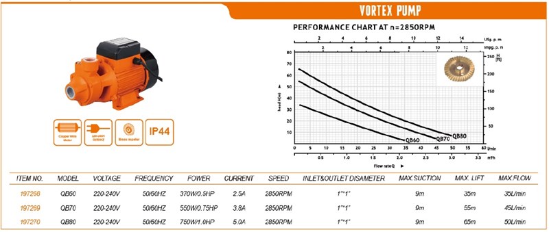 پمپ 0.75 اسب خانگی ورتکس فایندر Vortex QB70 (Finder Tools QB70 Vortex Pump) مناسب برای آبرسانی به منازل مسکونی ( ویلایی و آپارتمان ) میباشد.این الکتروپمپ از نوع تکفاز بوده و حداکثر دبی 2.7 متر مکعب در ساعت و حداکثر هد 55 متر دارد. این پمپ که یک پمپ چینی میباشد با توان 0/55 کیلووات باعث انتقال و یا افزایش فشار آب میشود. جنس بدنه پمپ از چدن، جنس پروانه از برنج و پوسته موتور آن از جنس آلومینیوم میباشد. این پمپ ها به دلیل ظاهر کوچک و مقرون به صرفه بودن از انواع پرطرفدار تجهیزات به شمار میروند